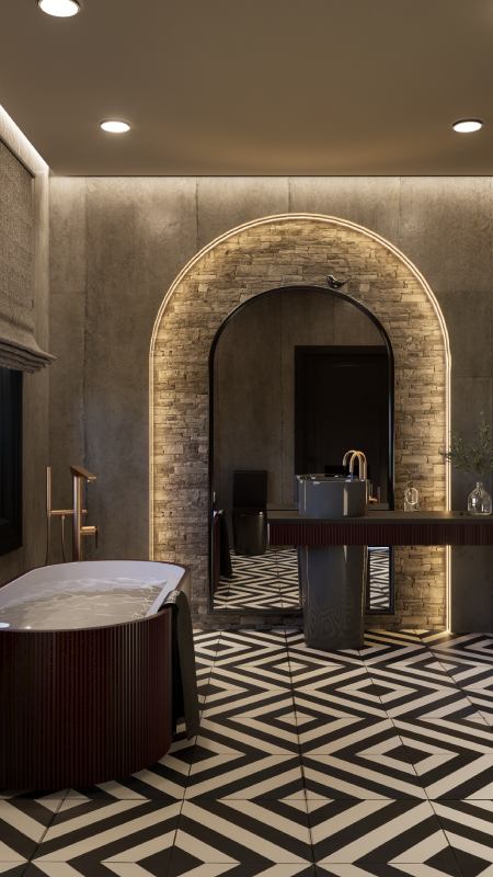 Projeyi İnceleBu mekân, neoklasik mimarinin zarif çizgilerini günümüz estetik anlayışıyla buluşturan sofistike bir iç tasarım yaklaşımıyla kurgulanmıştır. Duvar yüzeylerinde kullanılan kabartma paneller, zarif profiller ve kavisli pencere formları, mekâna klasik dönemin heykelsi ruhunu taşırken; açık ve koyu renk tonlarının birlikte kullanımı, kompozisyona güçlü bir kontrast ve modern bir derinlik kazandırır.